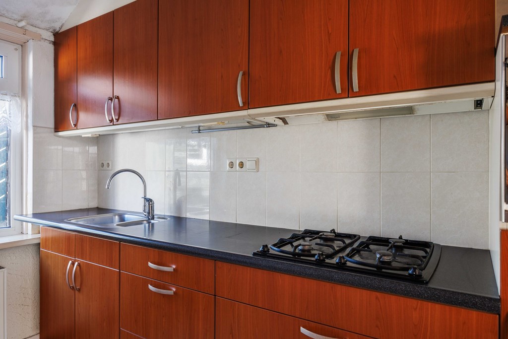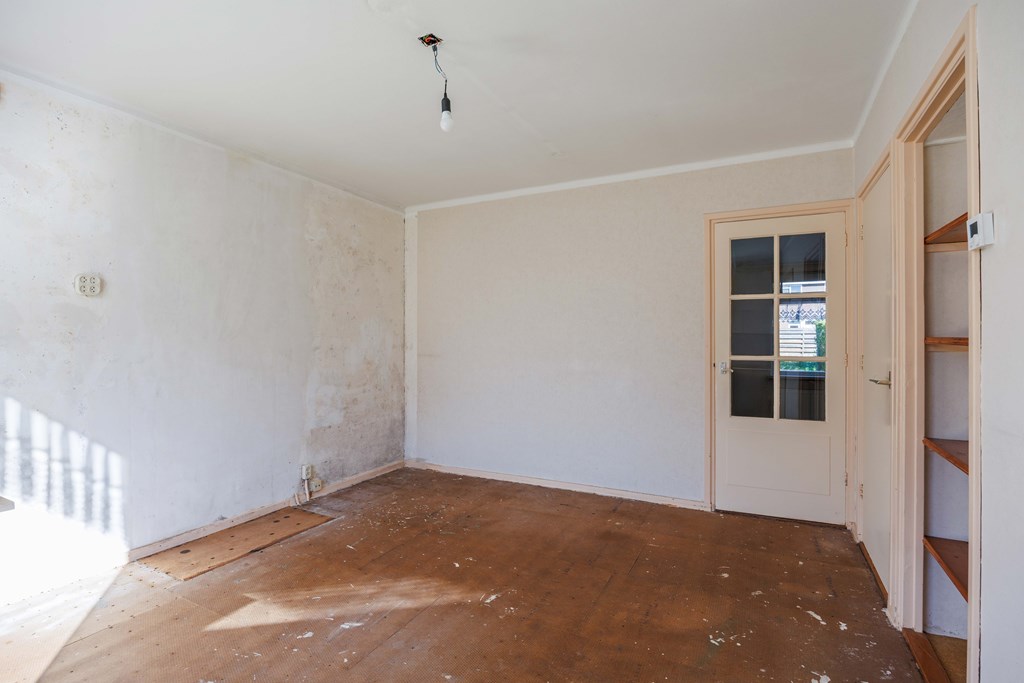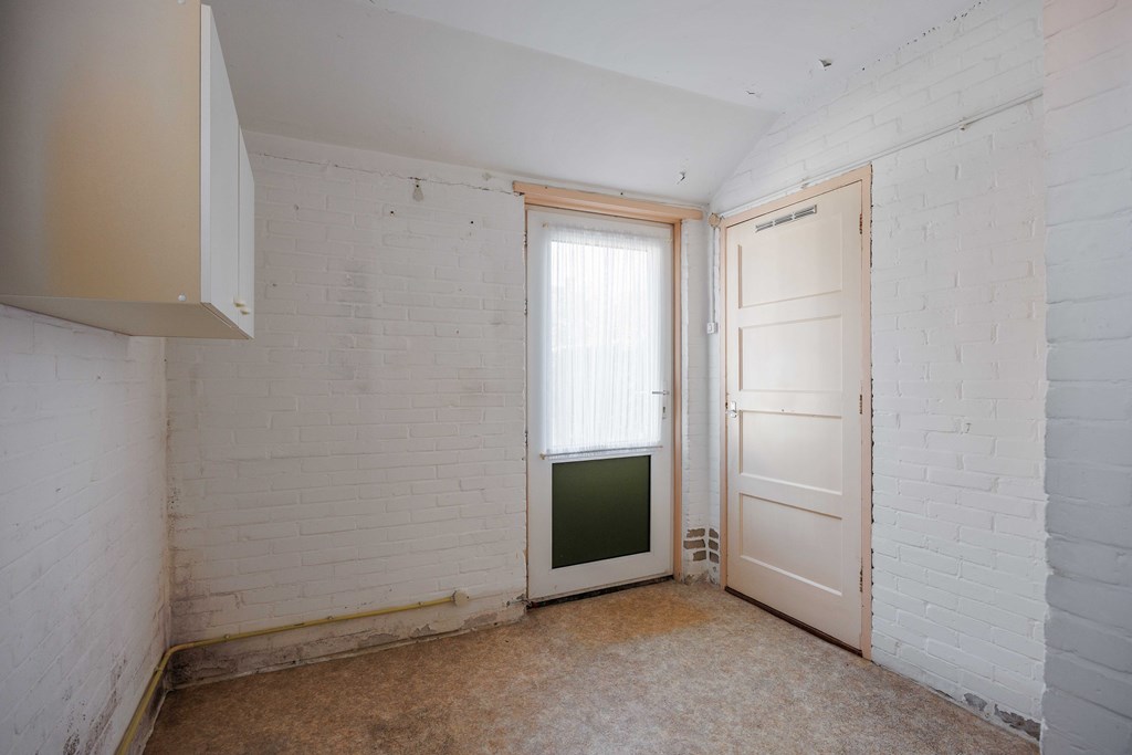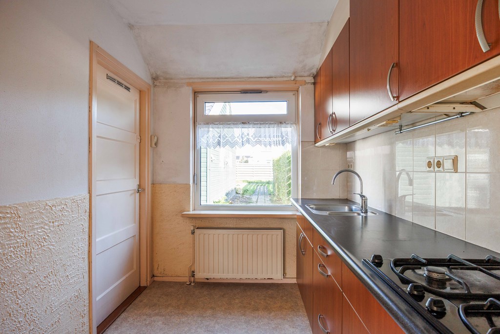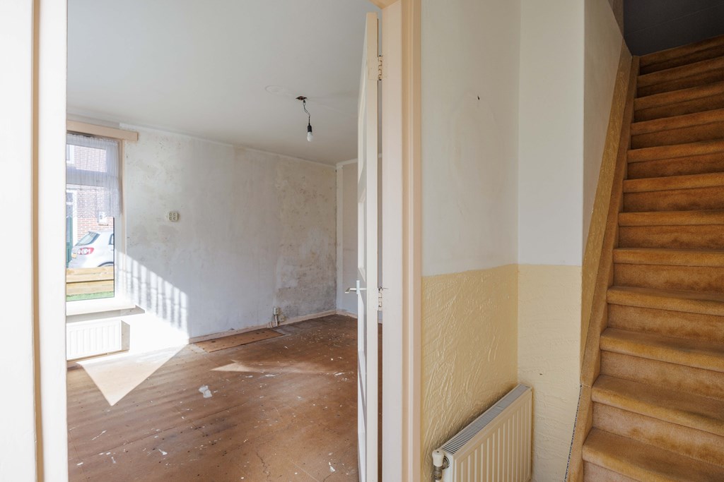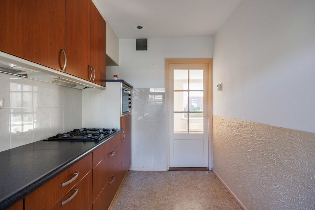 Entree/hal met meterkast (5 groepen) met de trapopgang naar de verdieping, ook de toegang tot de woonkamer. Vanuit de woonkamer is de verdiepte kelder aanwezig en tevens toegang tot de keuken met rechte opstelling, voorzien van koeler, combi magnetron/oven, spoelbak en 4-pits gaskomfoor met afzuiging. Vanuit de keuken kom je in de bijkeuken met het toilet, tevens achteringang, opstelling CV installatie en witgoedaansluitingen. De begane grond heeft behoudens de bijkeuken, houten vloeren.