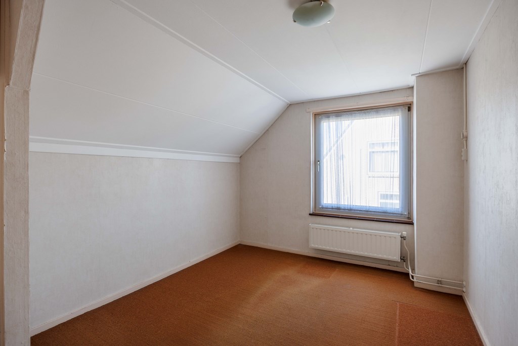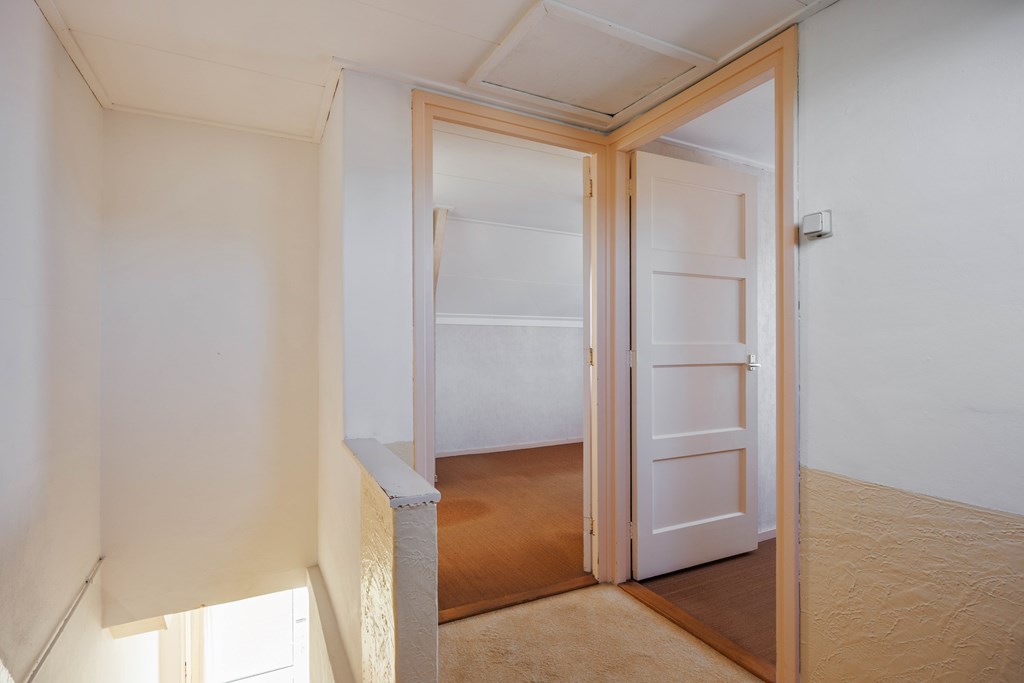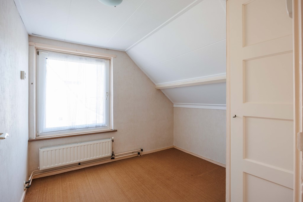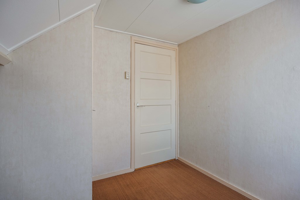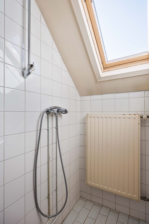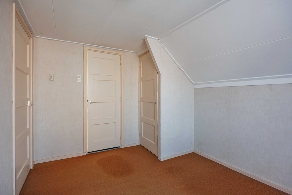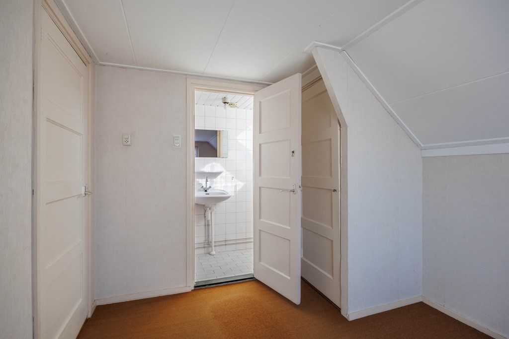 Middels vaste rechte trap toegang tot de verdieping met overloop met dakraam, twee slaapkamers met vaste kasten en een kleine badkamer met douche en vaste wastafel en ook voorzien van een dakraam. Op de verdieping zijn het betonvloeren.