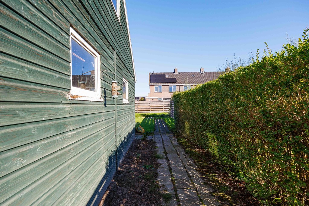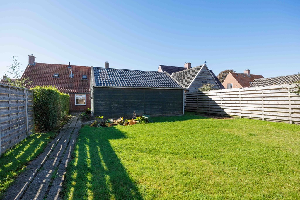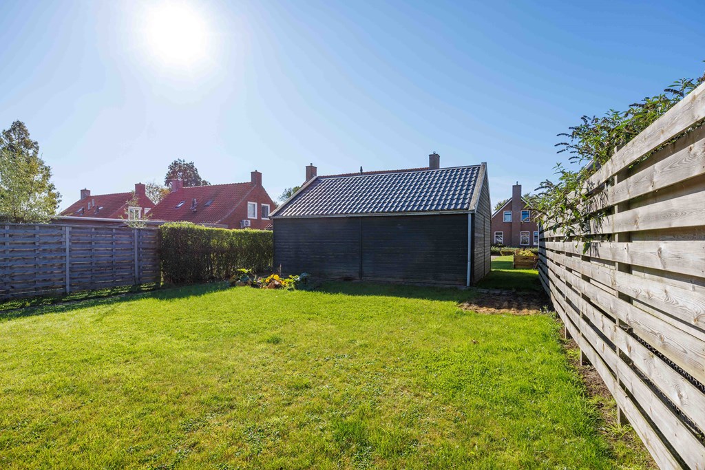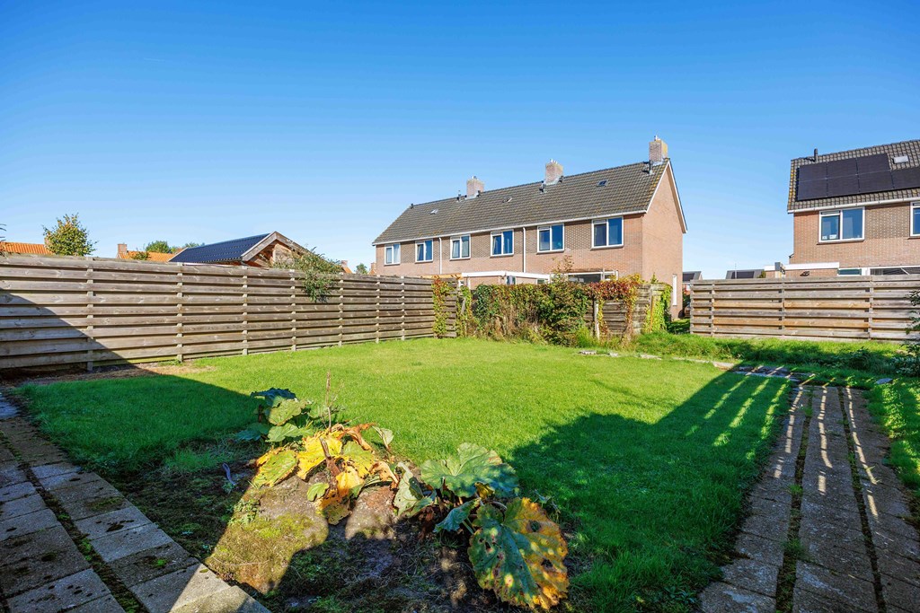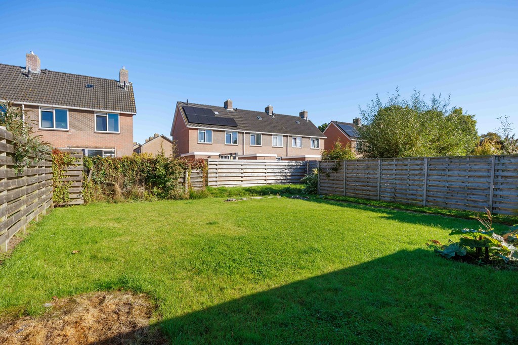 Aan de voorzijde en achterzijde zijn gazons. Een brede oprit naar de garage. De achtertuin is voorzien van schuttingen met de buren en aan de achterzijde is er een greppel.